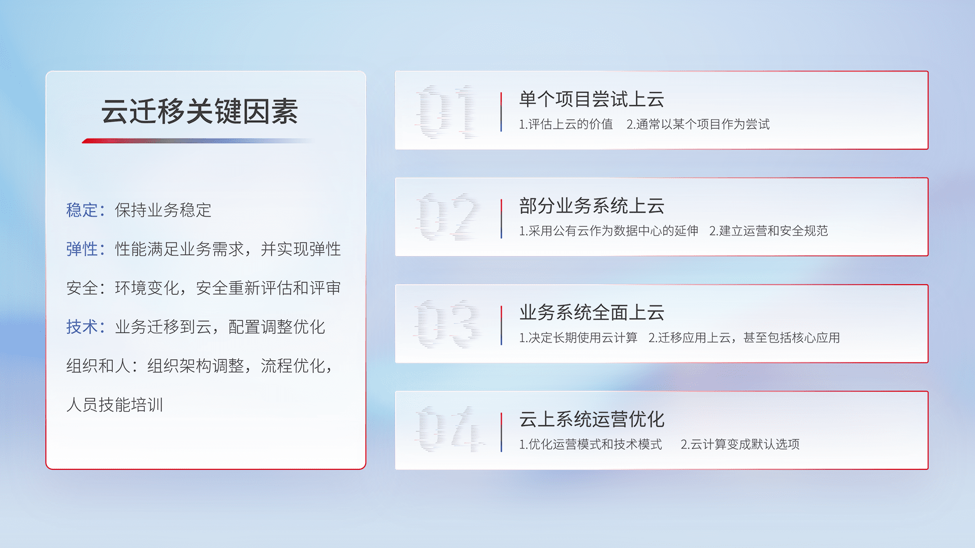 结合实际业务,,,,从规划设计、、、、云平台选型、、云原生改造、、、数据迁移、、、、集成交付,,迁移全过程为客户识别最佳上云路径,,,,做好风险识别管理,,,设计网络架构、、、、身份权限、、、安全审计合规、、、、操作审计、、日志审计、、、、监控告警策略、、多站点容灾设计等,,,对云上基础设施进行整体规划,,,提升IT治理水平,,以满足弹性、、、、高可用、、、、高性能的需求。。。。
