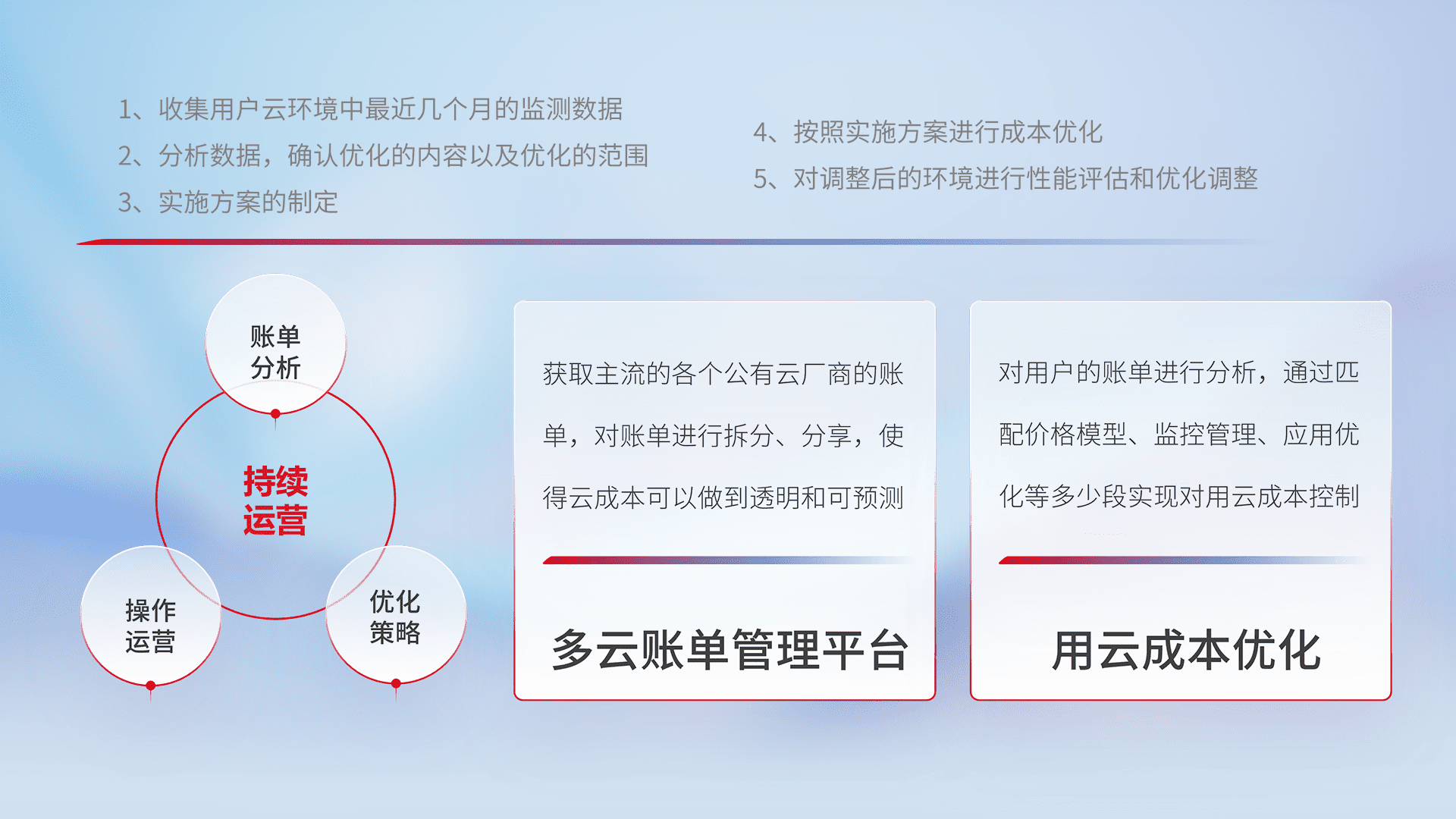 通过多云纳管,,以统一的资源数据模型把客户的云资源进行抽象和封装,,,进而实现对多云资源的统一操作,,保障云资源管理的可靠性、、、、稳定性与可用性。。。量身定制化运维内容,,,配置、、开发运维、、、、补丁管理、、、备份、、、、监控、、、认证和访问管理、、、审计和日常巡检等,,,保障在用云过程中的可靠度,,稳定度以及高可用率。。。